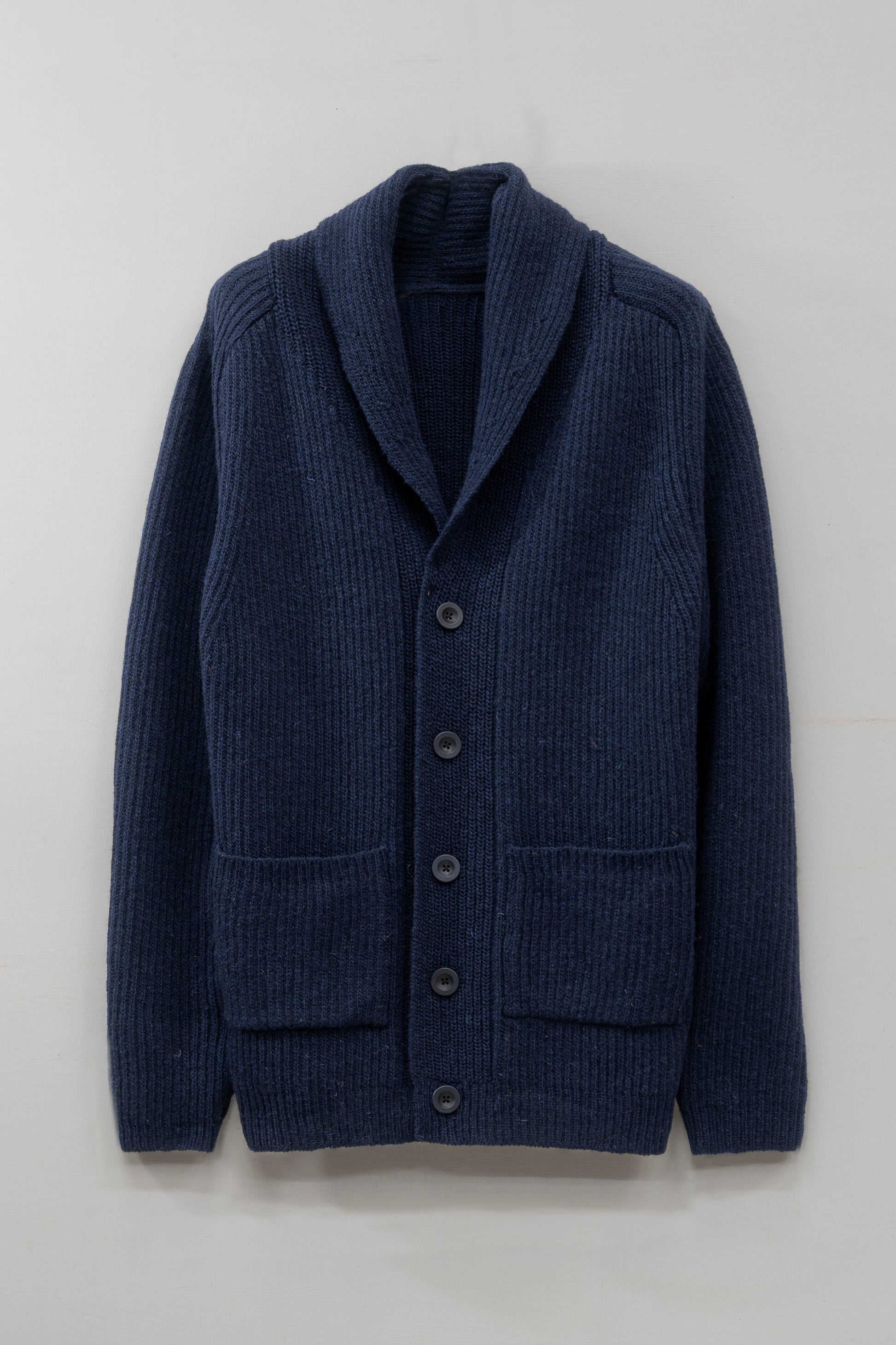 The Betheca Cardigan is made from a blend of 50% Irish wool and 50% Merino Wool. The knit is ribbed throughout, giving it a timeless and substantial look, with a shawl collar for added warmth and a classic, relaxed silhouette.